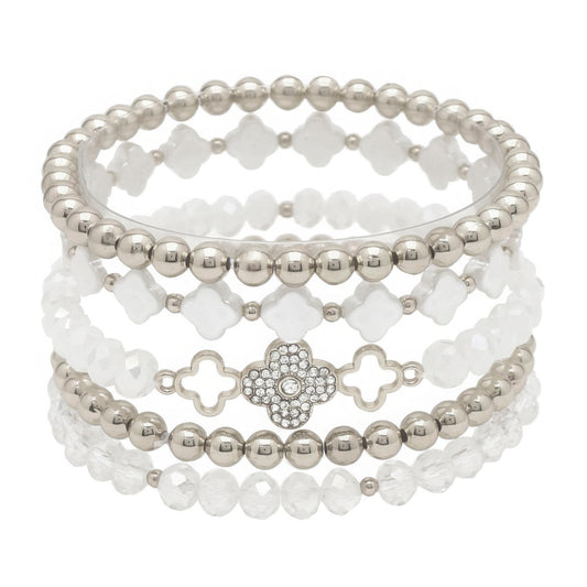 Clover Metal Pearl Rhinestone Stretch Bracelet Set